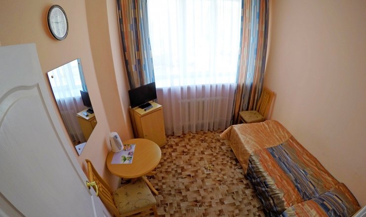 В номере: стол, 1 стул, встроенный шкаф-купе, телевизор, холодильник, электрочайник, фен, односпальная кровать.