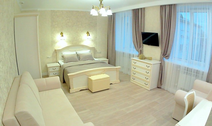В номере: стол, 2 стула, кресло, журнальный столик, шкаф, гладильная доска, кондиционер, микроволновая печь, посуда, телевизор, утюг, фен, холодильник, электрочайник, мягкая мебель, спальный гарнитур с двуспальной кроватью, кухня. Либо: журнальный столик, шкаф-купе, гладильная доска, кондиционер, микроволновая печь, посуда, телевизор, утюг, фен, холодильник, электрочайник, мягкая мебель, спальный гарнитур с двуспальной кроватью.